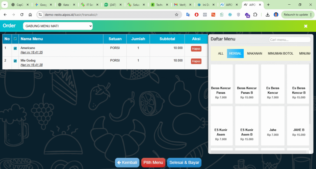Selain perbedaan alur transaksi, AIPOS Resto juga menggantikan konsep gudang pada retail menjadi dapur restoran. Dengan demikian, setiap menu produksi seperti nasi goreng, mie goreng, atau minuman racikan telah terhubung langsung dengan resep bahan baku. Sistem AIPOS secara otomatis menghitung kebutuhan bahan dan menentukan HPP per porsi, sehingga pemilik usaha dapat mengetahui biaya produksi secara akurat.