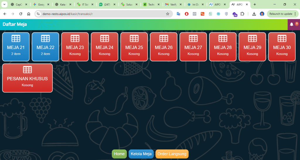 Pada bisnis restoran, transaksi tidak selalu selesai dalam satu waktu. Sebagai contoh, Meja 1 dapat memesan beberapa menu terlebih dahulu, kemudian menambahkan pesanan sebelum transaksi ditutup. Sementara itu, Meja 2 dapat memiliki pesanan yang masih berjalan. Oleh karena itu, AIPOS Resto menyediakan sistem manajemen meja yang fleksibel dan real-time, berbeda dengan sistem retail yang langsung menyelesaikan transaksi dalam satu proses.
