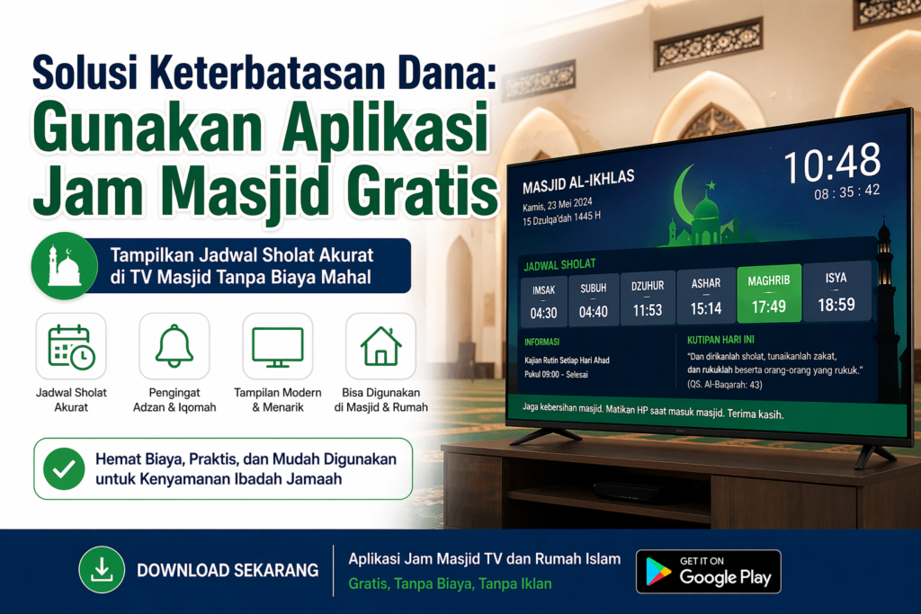 Namun demikian, perkembangan teknologi saat ini membuka peluang yang jauh lebih luas. Pengurus masjid tidak lagi harus bergantung pada perangkat mahal untuk menampilkan jadwal sholat secara digital. Sebaliknya, mereka bisa memanfaatkan aplikasi jam masjid gratis yang dapat digunakan melalui TV atau layar sederhana. Dengan pendekatan ini, masjid tetap bisa memberikan layanan informasi yang optimal tanpa harus mengeluarkan biaya besar.