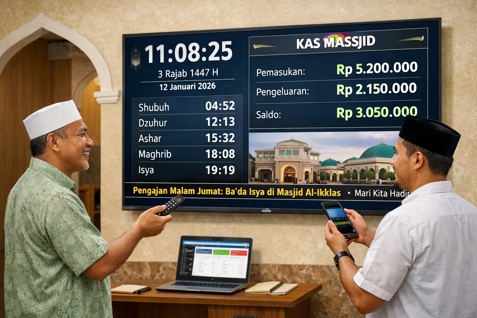 Jam masjid digital berbasis Android TV kini menjadi solusi praktis bagi pengurus masjid dalam mengelola informasi ibadah dan kegiatan secara