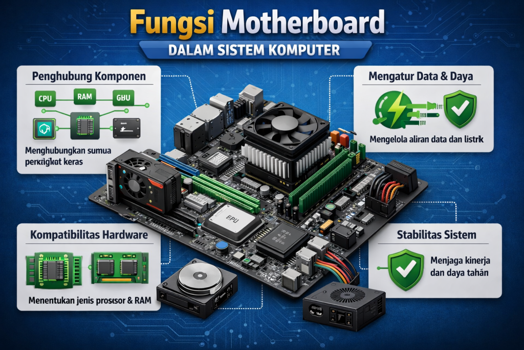Fungsi motherboard dalam sistem komputer sangat penting karena komponen ini menjadi pusat penghubung seluruh perangkat keras. Motherboard berperan sebagai papan sirkuit utama yang memungkinkan setiap komponen komputer bekerja secara terintegrasi. Tanpa motherboard, sistem komputer tidak dapat beroperasi dengan normal.