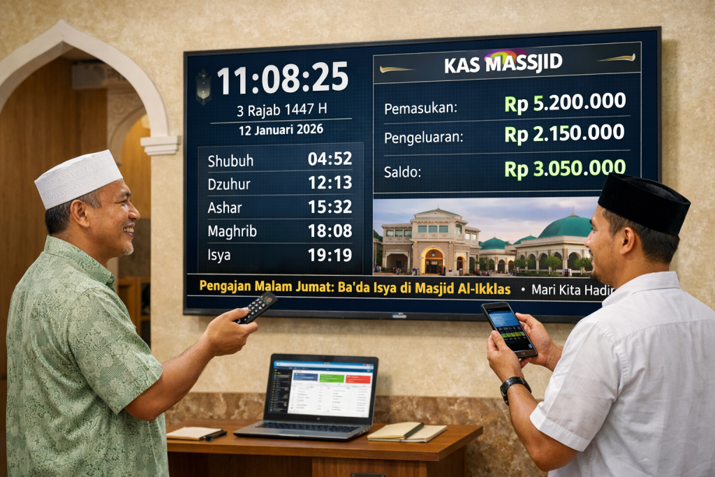 Jam masjid digital berbasis Android TV kini menjadi solusi praktis bagi pengurus masjid dalam mengelola informasi ibadah dan kegiatan secara rapi dan efisien. Melalui satu layar, pengurus masjid dapat menampilkan jadwal shalat, pengumuman, hingga informasi kas dengan cara yang lebih modern dan mudah dipahami jamaah.