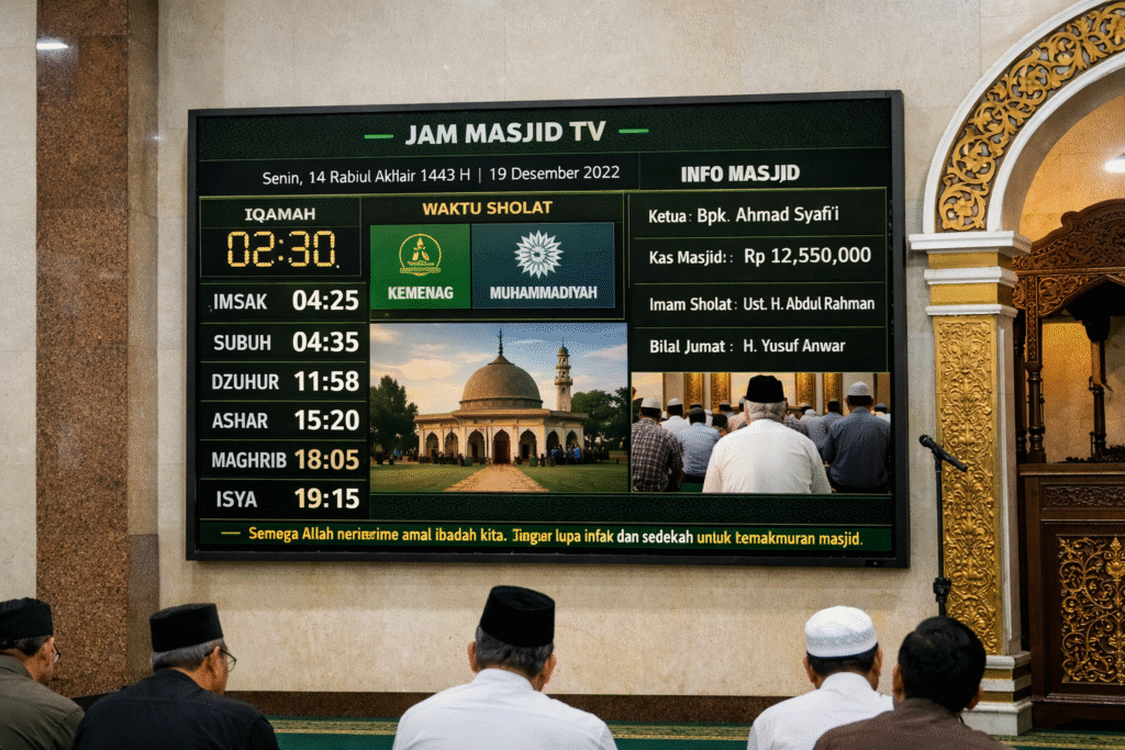 Sekarang, masyarakat mengakses informasi lewat layar setiap hari. Mereka melihat jadwal di smartphone, membaca pengumuman di televisi, dan memantau update secara real time. Jadi, mengapa masjid tidak memanfaatkan layar digital sebagai pusat informasi ibadah? Di sinilah Jam Masjid TV mengambil peran penting.