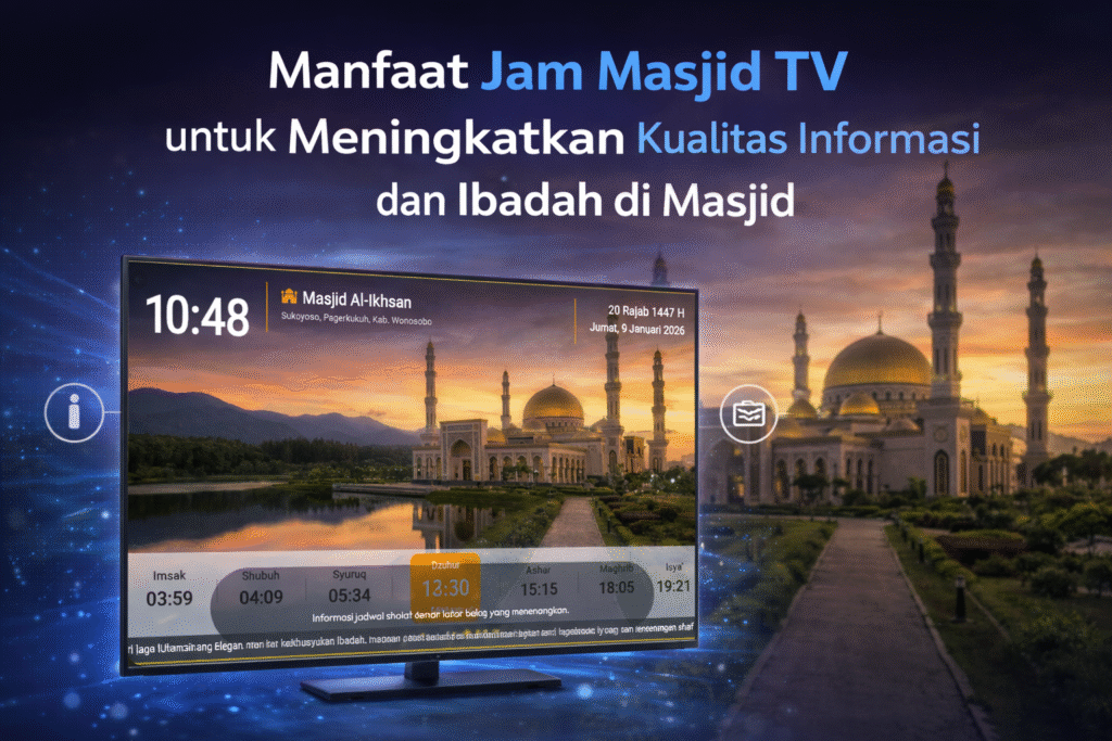 Jam Masjid TV membantu pengurus masjid menyampaikan informasi secara visual melalui layar televisi yang terpasang di area strategis. Selain itu, PT. Dieng Cyber Indonesia mengembangkan sistem ini sehingga pengelola dapat mengatur jadwal sholat, waktu iqamah, countdown adzan, hingga informasi kegiatan secara praktis melalui dashboard digital. Melalui tampilan yang menarik dan terstruktur, jamaah dapat memahami informasi dengan cepat. Dengan demikian, masjid tidak hanya berfungsi sebagai tempat ibadah, tetapi juga menjadi pusat informasi yang tertata, modern, dan profesional.