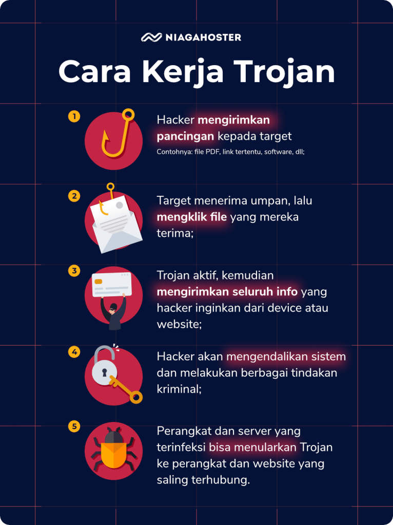 Trojan adalah malware yang bisa menyamar menjadi link, file, software, Bahkan email ‘yang seolah-olah datang dari perusahaan resmi.